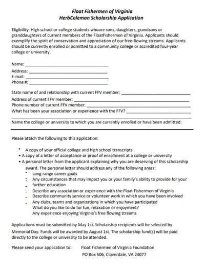The Herb Coleman Scholarship application is now available for high school or college students who are sons, daughters, grandsons or granddaughters of current members of the Float Fisherman of Virginia. Applicants should exemplify the spirit of conservation and appreciation of our free-flowing streams. Applicants should be currently enrolled or admitted to a community college or accredited four-year college or university. Click below to learn more and download the application.